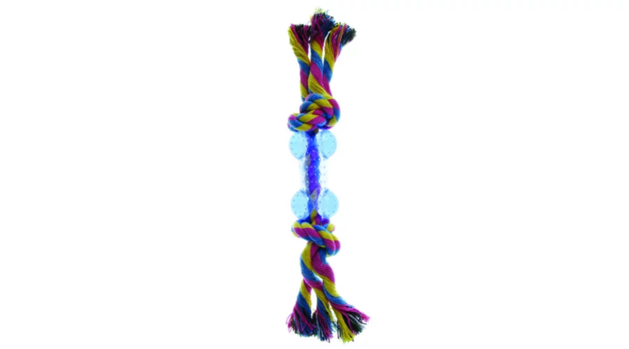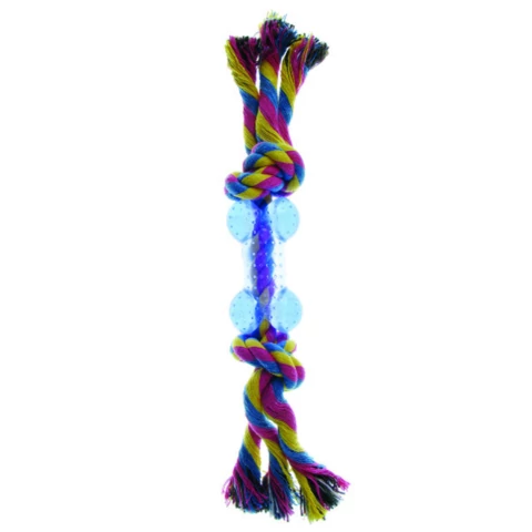 Tökéletes választás minden játékos kutyának! Erős, színes kötélből és rugalmas gumicsontból készült, így egyszerre szórakoztat és segít a fogak tisztán tartásában. Ideális húzós és rágós játékhoz, valamint közös mókázáshoz.